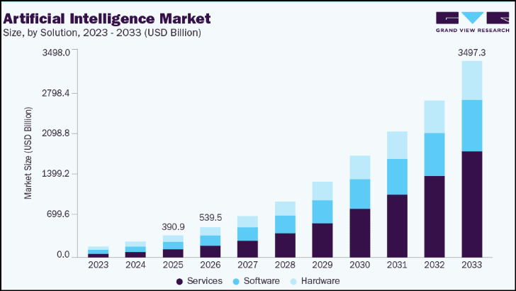 Hodnota trhu s umělou inteligencí s projekcí do roku 2033.