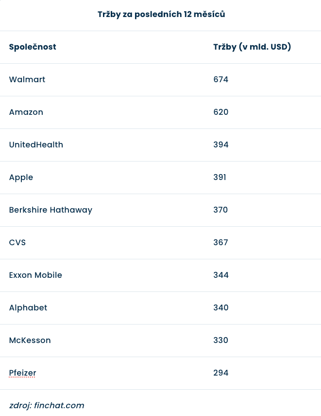 UnitedHealth Group, největší zdravotnická společnost v USA, utržila 394 miliard dolarů. Apple, technologická jednička, zůstává s 391 miliardami dolarů v závěsu. Na páté příčce se nachází Buffettova Berkshire Hathaway.