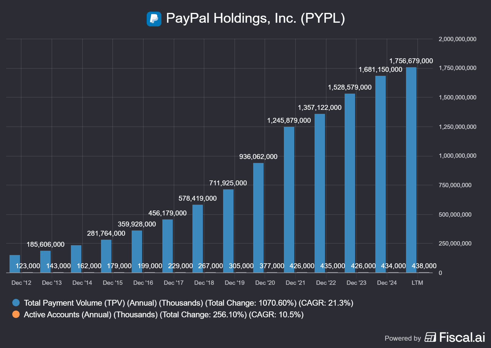 Objem zpracovaných plateb a počet aktivních účtů u PayPalu