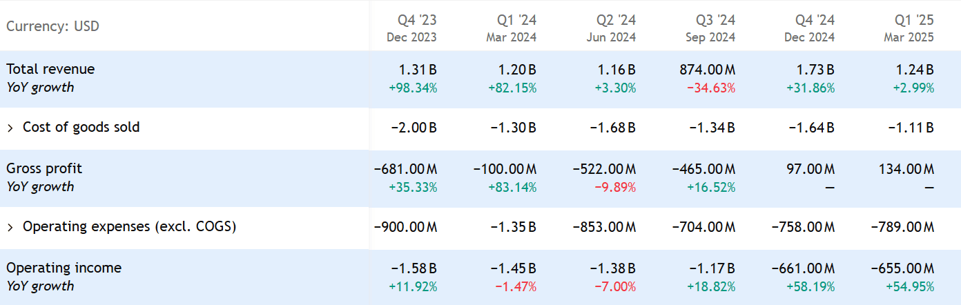 Tržby za Q1 2025 rostly jen o 2,9 % meziročně. Celkově firma zatím stále generuje ztráty.