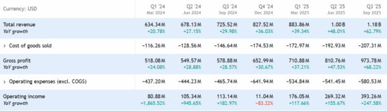 Společnost oznámila tržby přibližně 1,18 miliardy dolarů, což představuje meziroční růst o 63 % a znamená to další rekordní kvartál v řadě.