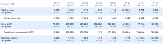 Pozitivní je ale to, že hrubá marže se zhoupla do zisku v Q4 2024 a dosáhla 9,8 %. V Q1 2025 se hrubá marže dále zvýšila na 16,6 %.