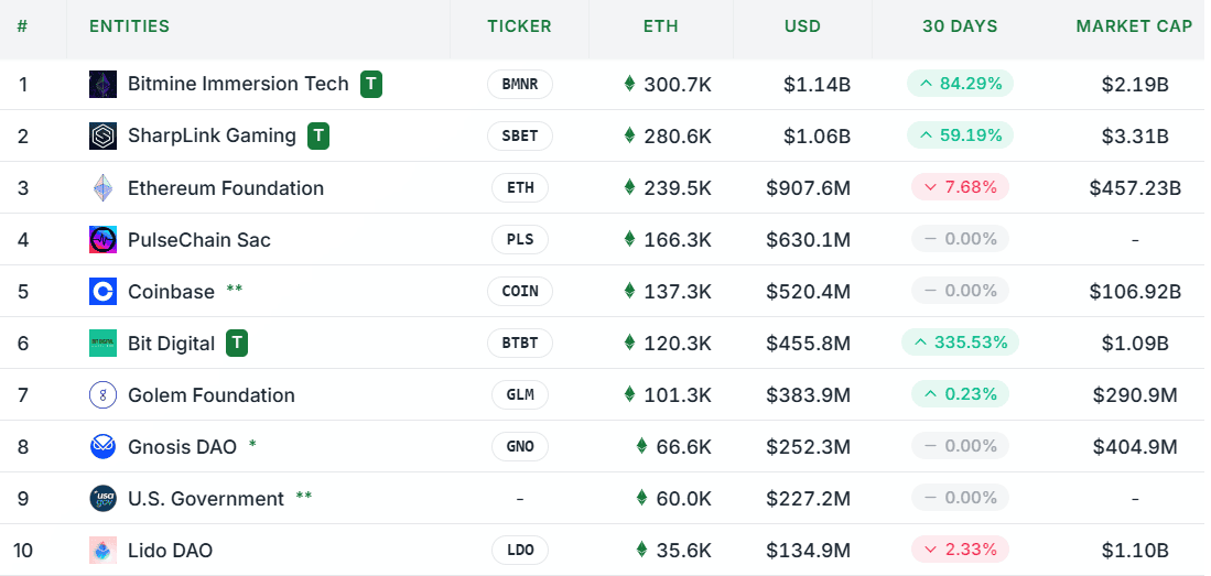 Největším korporátním držitelem Etherea je v současnosti společnost Bitmine Immersion Tech a hned za ní je SharpLink Gaming.