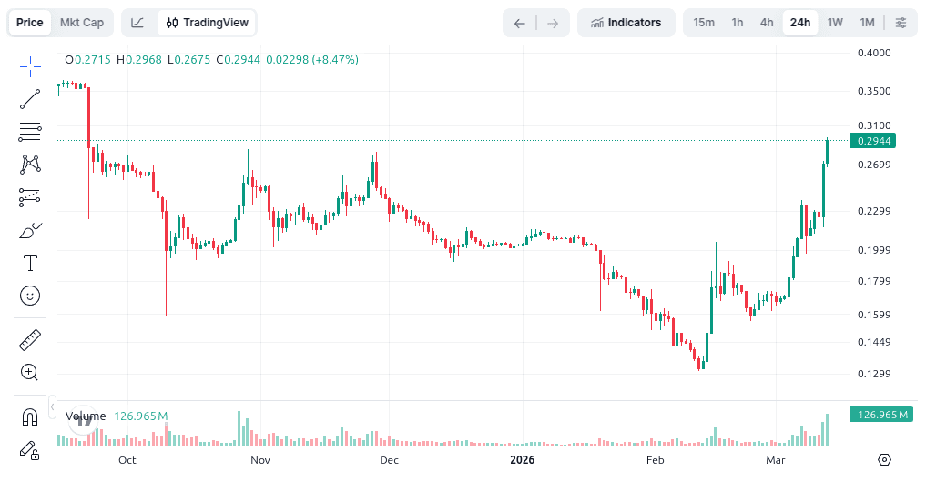 Digitální aktivum během pátečního ranního obchodování v Asii posílilo přibližně o 30 %, a to krátce poté, co kryptoměnová burza Kraken oznámila, že plánuje token zařadit do své nabídky.
