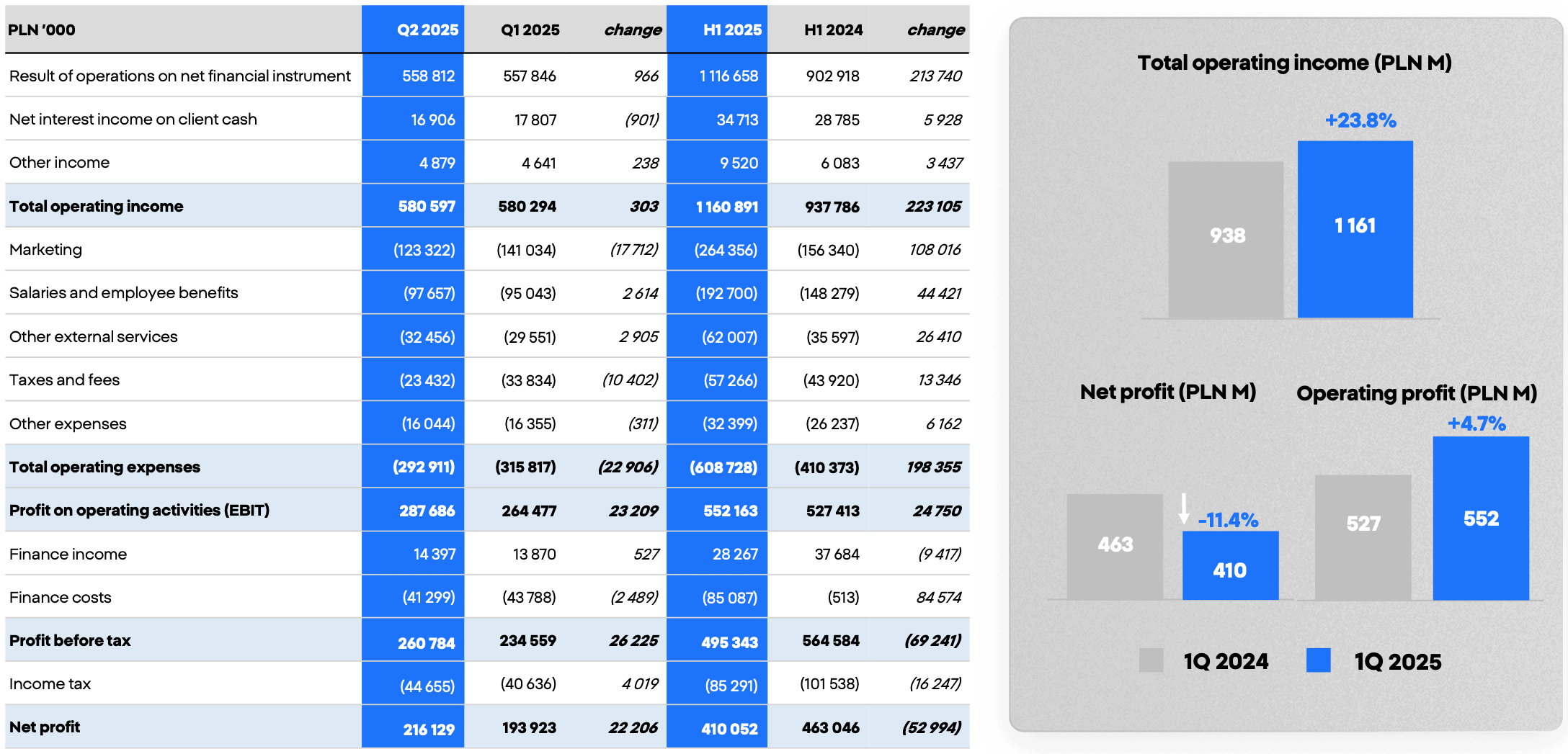 Broker XTB zakončil první pololetí roku 2025 s rekordními provozními výnosy 1,161 mld. PLN (meziročně +24 %).