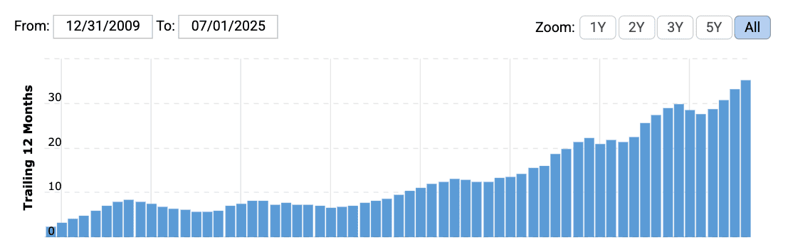 Tržby ASML vzrostly z pouhých 2,26 miliardy USDv roce 2009 až na35 miliard USD v posledních 12 měsících – dechberoucí nárůst o víc než1 400 %.