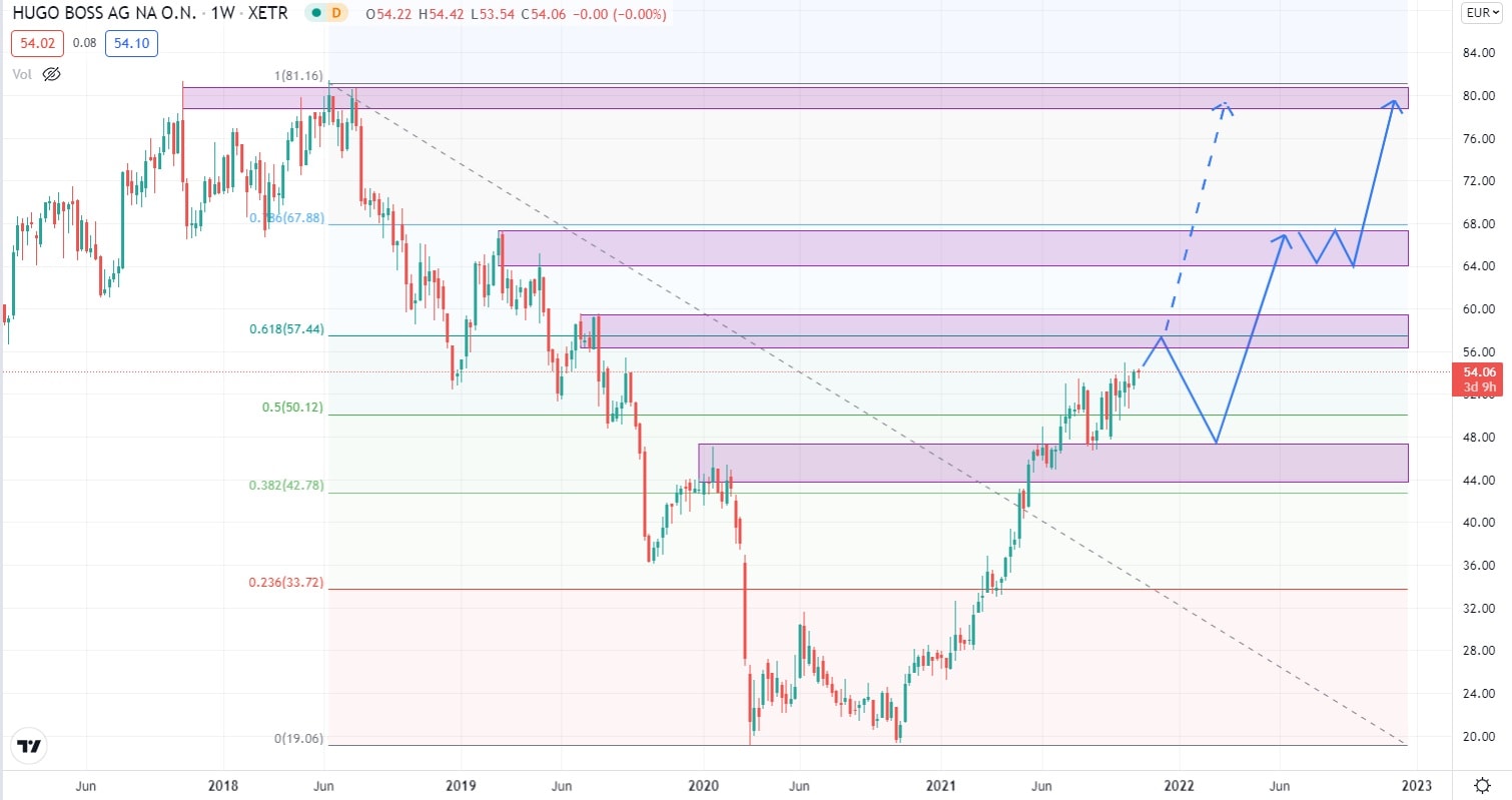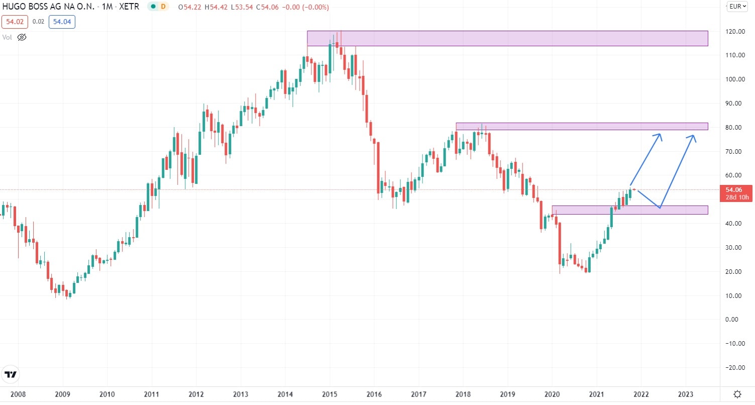 Aktivní kumulace nákupních příkazů společně s fundamentálním výhledem v segmentu luxusního oblečení, může následně podpořit růst ceny akcií společnosti HUGO BOSS AG až k ceně 80 EUR za akcii, což by k současné pozici trhu znamenala téměř 100% nárůst.