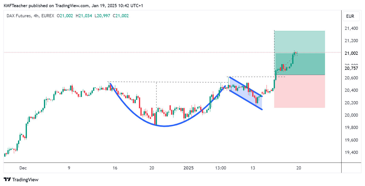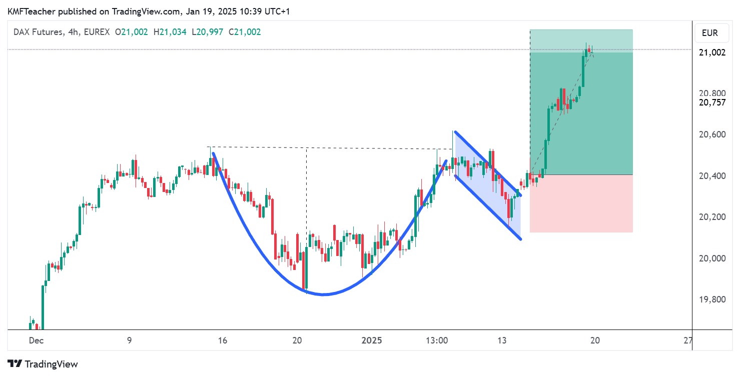 Index DAX na H4 časovém rámci a formace Cup with Handle – konzervativní vstup
