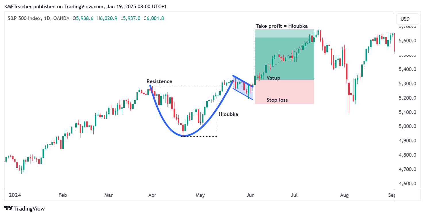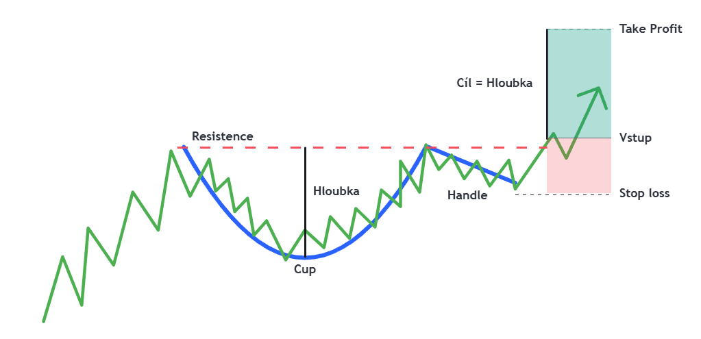 Stop loss je pod nejnižším bodem Handle a take profit se rovná hloubce formace.