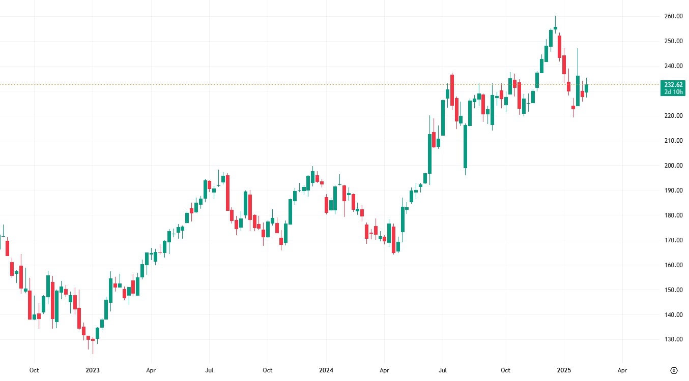 Týdenní svíčkový graf akcií Apple