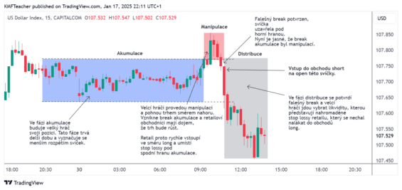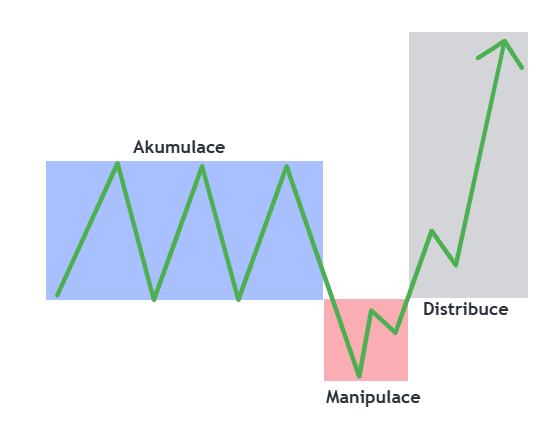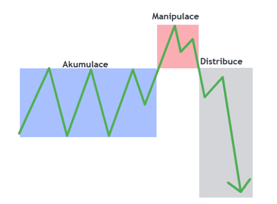 Nejprve dojde opět k akumulaci, poté cena udělá break směrem dolů, což je manipulace.