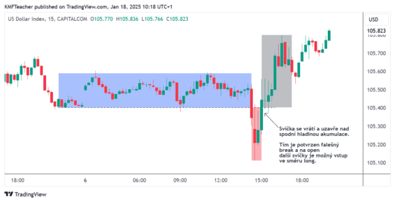 Tento break se ukáže jako falešný, jakmile se cena dostane nad spodní hranu akumulace a nad ní uzavře.