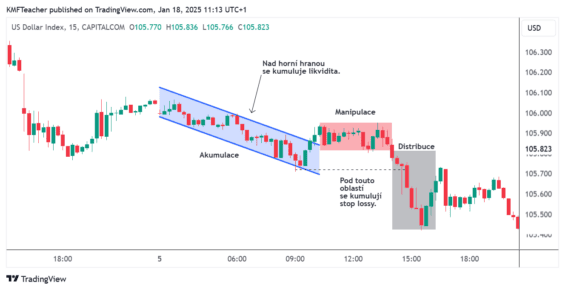 Poté následuje distribuce, kdy velký hráč jde vybrat stop lossy, které jsou nad akumulací.