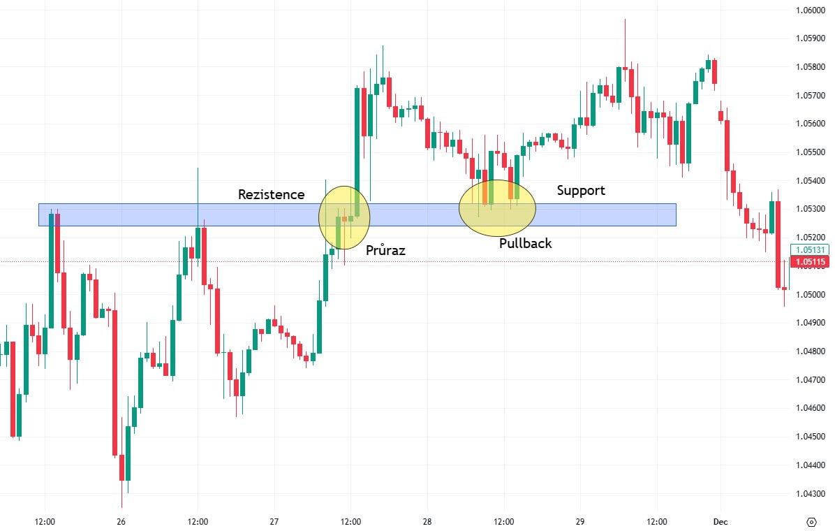 Princip pullbacku a throwbacku je založen na průrazu supportní nebo rezistentní zóny s následným retestem a pokračováním ve směru průrazu.
