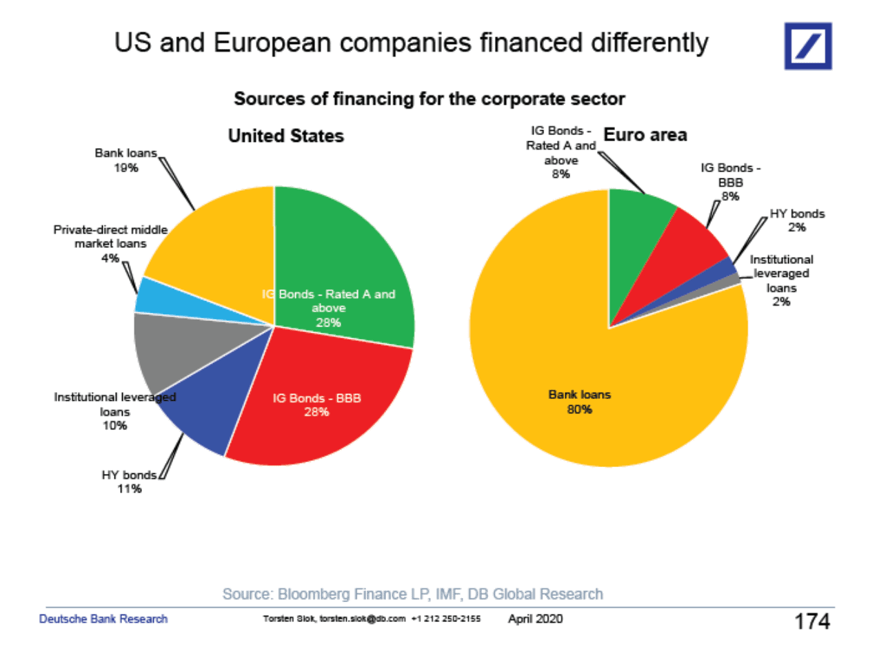 Bloomberg nedávno citoval report Deutsche Bank, který nepoměr ve financování korporátního sektoru ukázal v přehledném grafu. Evropský model ekonomiky zcela zřetelně dává přednost financování bankovními půjčkami před burzovním kapitálem.