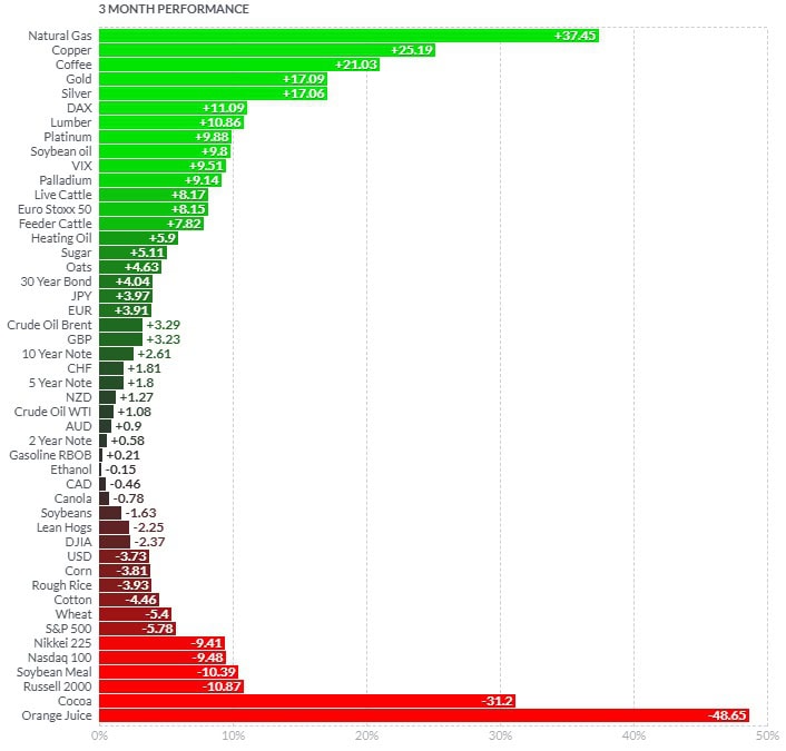 Nejsilnější komoditou byl v Q1 zemní plyn, který posílil o 37,43 %. Na druhém místě se umístila měď a na třetím káva. I přes to, že zlato celý kvartál vytvářelo svá nová cenová maxima, co se týče růstu, stačilo to pouze na čtvrté místo.