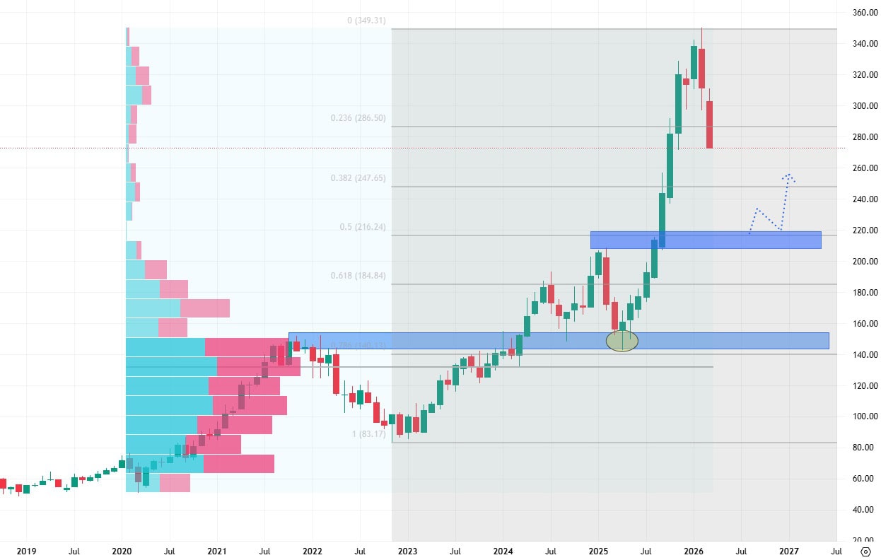 Přestože výhled analytiků z Wall Street zůstává pro tyto akcie pozitivní, současná realita naznačuje spíše začátek výraznějšího klesajícího trendu (downtrendu).