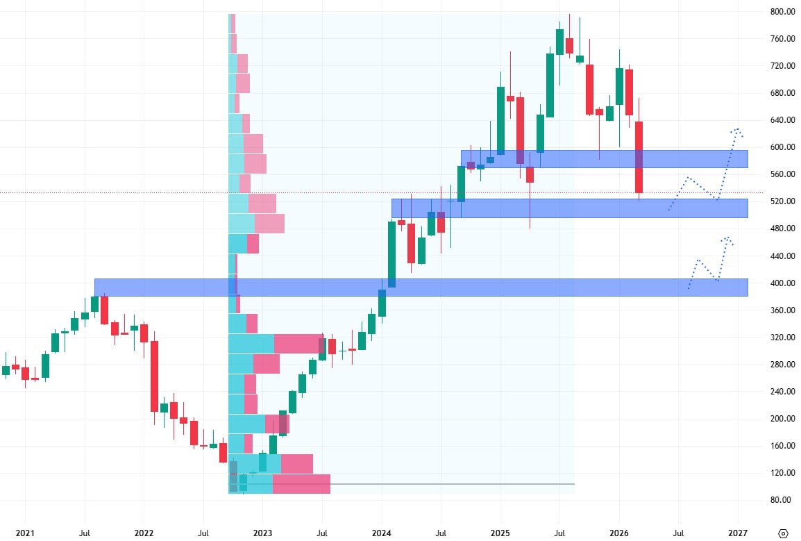 Pokud by k němu došlo, může cena akcií klesnout až ke 400 USD. Zde se nachází další úroveň supportu v podobě dříve proraženého cenového maxima z roku 2021.