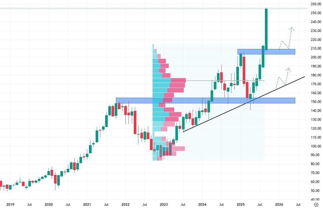 Pokud by se akcie na současných hodnotách dokázaly udržet, může být naplněna i pozitivní cenová predikce, která počítá s atakováním 290 USD.