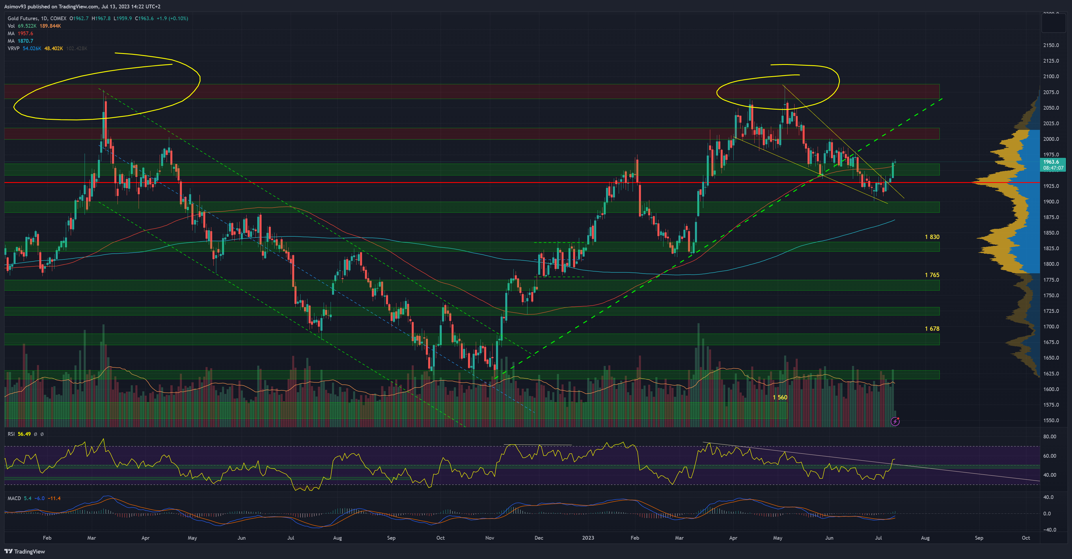 Pro zlato je důležité, aby došlo k postupu skrze cenové úrovně nad aktuálním supportem. Když se podíváte na volume profile, na 1 980 USD za unci je high volume node. Ve prospěch dalšího růstu je indikátor RSI. Všimněte si, že křivka indikátoru překonala klesající trendovou čáru a zároveň zakreslenou rezistenci.