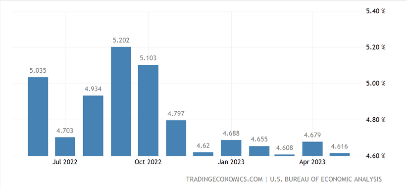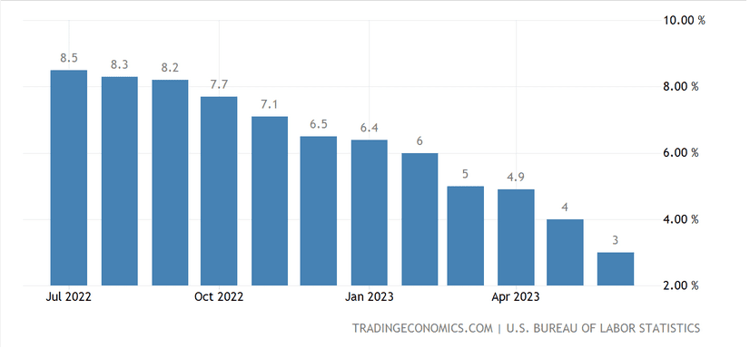Máme čerstvá data o inflaci ze Spojených států, která jsou měřená metodikou CPI. Dle dat na první pohled vidíme, že tempo růstu cenové hladiny velmi rychle klesá. Ještě za leden činila celková inflace 6,4 %, za červen “pouhá” 3 %. A stále vidíme, že inflace vcelku dynamicky klesá.