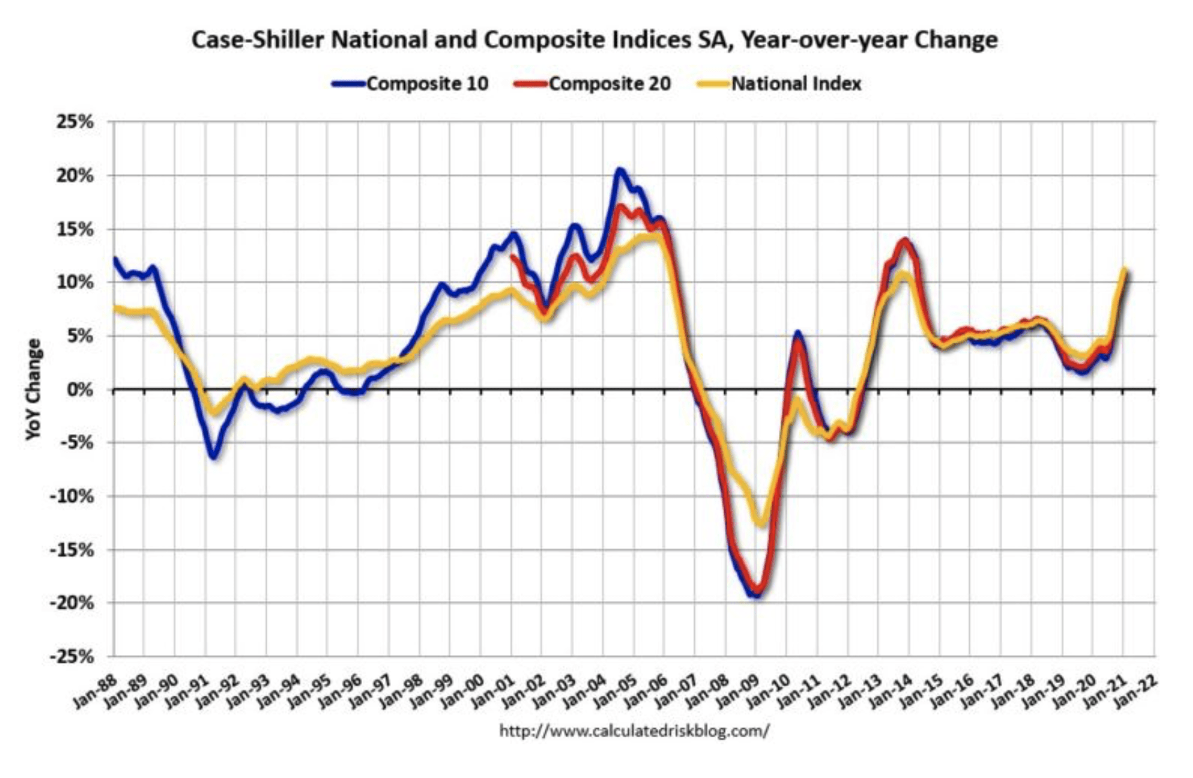 Dynamika růstu cen nemovitostí v USA. Zdroj: calculatedriskblog.com