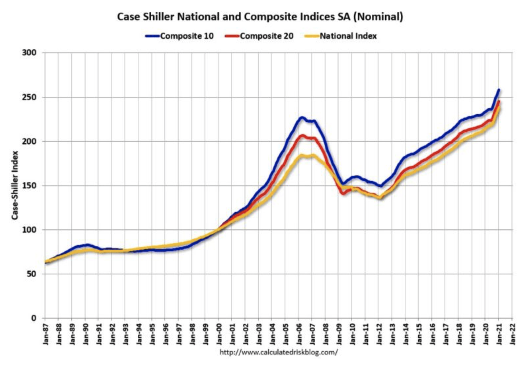S&P Case Shiller index cen nemovitostí v USA dosahuje nových rekordů. Index 20 metropolitních oblastí (červený) už dosahuje téměř 250 bodů. Dosahuje úrovně o 20 % nad maximem dosaženým v roce 2006 před splasknutím nemovitostní bubliny – je dnes na trhu nemovitostní bublina?