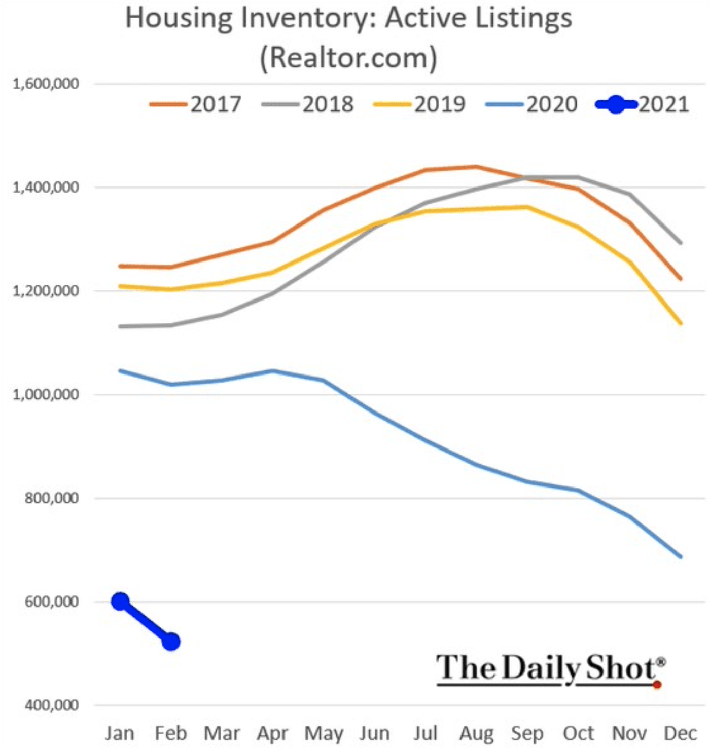 Obrázek níže ukazuje nabídku domů k prodeji dle serveru realtor.com podle jednotlivých let. V roce 2021 bylo na trhu až o 50 % méně domů než v roce 2020. V roce 2021 bylo na trhu dokonce až o 60 % méně než v roce 2019.