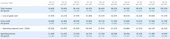 Finanční výsledky za třetí čtvrtletí roku 2025 překonaly očekávání analytiků. Tržby dosáhly přibližně 102,3 miliardy USD, což znamená meziroční růst o zhruba 16 %.