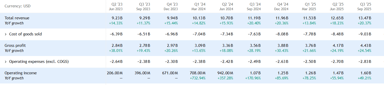 Uber ve třetím čtvrtletí roku 2025 potvrdil silný růst v jádru svého podnikání, kterým je přeprava a doručování. Tržby dosáhly zhruba 13,5 miliardy USD, což je meziroční nárůst o 20 %.