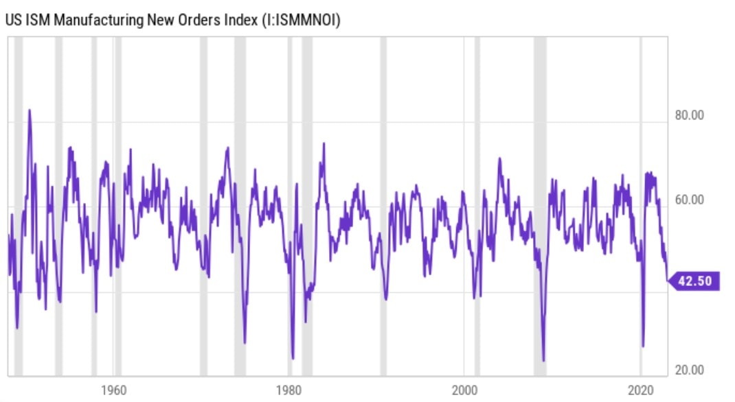 Ptáte se, na jaké úrovni se index nových zakázek ve zpracovatelském průmyslu USA ISM nachází nyní? V lednu 2023 dosáhl neuspokojivé hodnoty 42,5. Na základě tohoto údaje a historie tohoto indexu za posledních 70 let se zdá, že recese je na spadnutí.