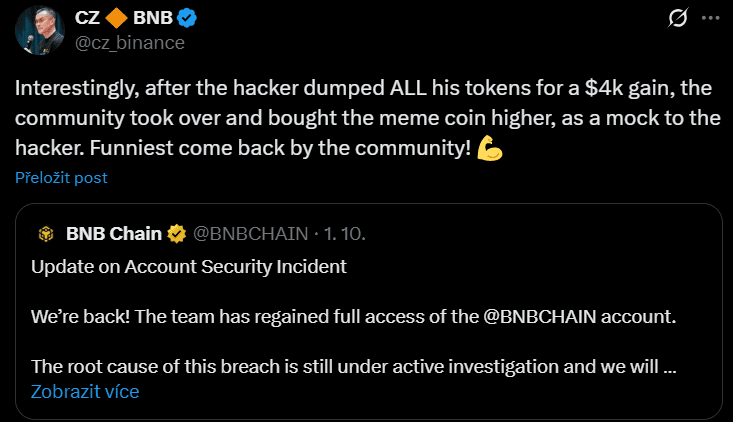 Tento trader může být vděčný bývalému generálnímu řediteli a spoluzakladateli Binance, Changpengu “CZ” Zhaovi, který na meme coin upozornil ve svém příspěvku na síti X.