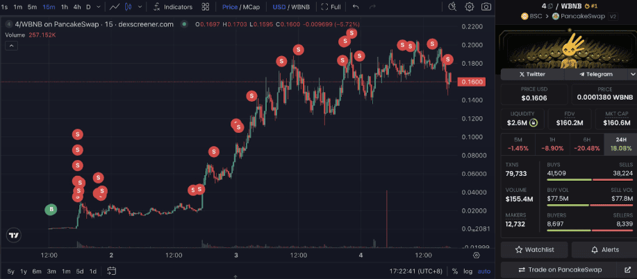 Prudký růst tokenu 4 následoval po Zhaovo zmínce na síti X, kde sdílel příspěvek o incidentu na síti BNB. Jen několik minut předtím, než se jeho příspěvek stal virálním, nakoupila zmiňovaná peněženka značné množství tohoto tokenu.