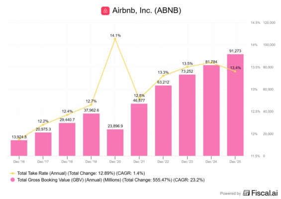 Pro pochopení celého byznysu Airbnb je klíčový hrubý objem rezervací (Gross Booking Value, GBV) a podíl, který si z něj platforma dokáže ukrojit (tzv. take rate).