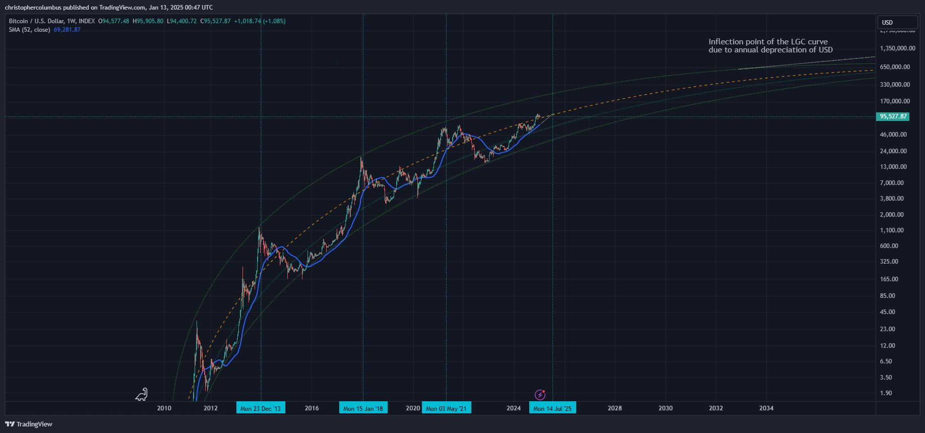 Trader Bitcoinu Dave the Wave poznamenává, že Bitcoin historicky dosahuje vrcholu, když jednoletý klouzavý průměr protíná střední pásmo logaritmické růstové křivky (LGC).