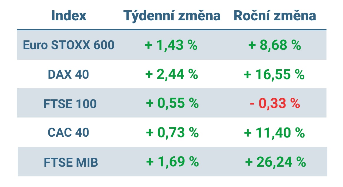 Tabulka ukazuje vývoj nejvýznamnějších evropských indexů v tomto týdnu a roce 2023