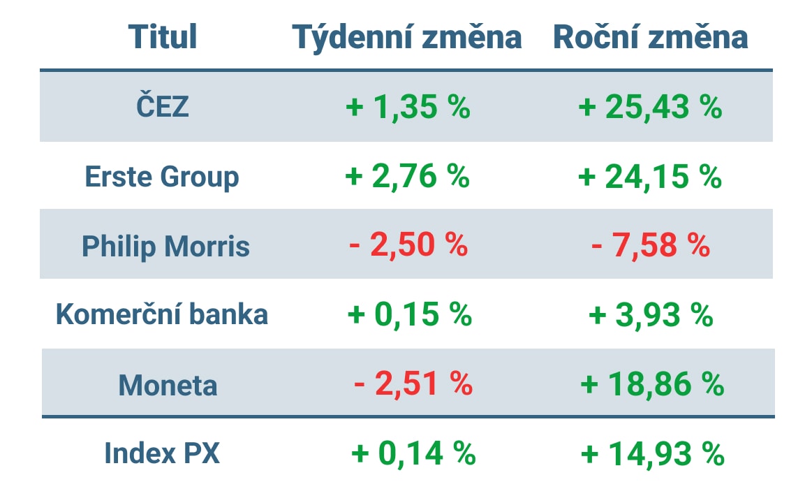 Pražská burza rostla již třetí týden v řadě, když index PX nepatrně posílil o 0,14 %. Největších poraženým se staly akcie Photon Energy, které odepsaly přibližně 4,5 %. Vítězem týdne se na druhé straně staly akcie Erste Group, které si téměř 3 % připsaly.