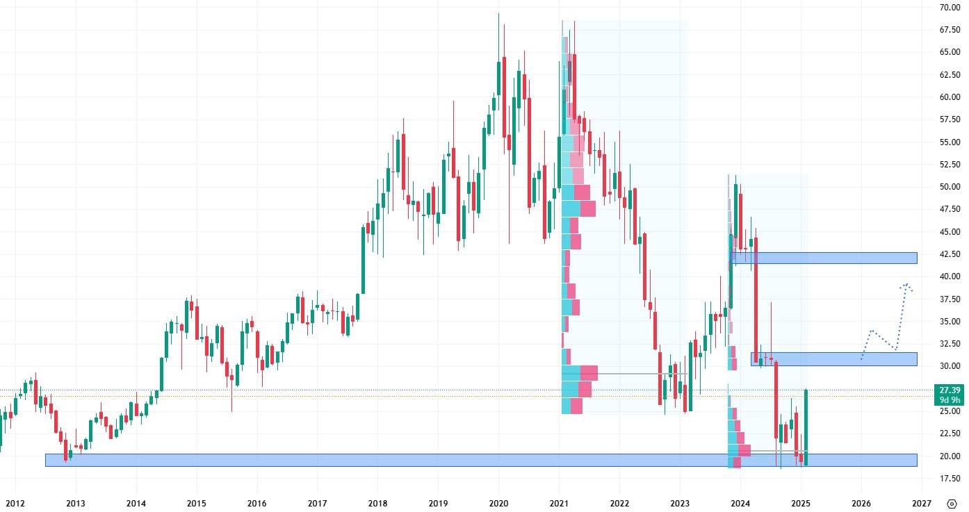 Při svém cenovém poklesu akcie ovšem otestovaly úrovně z roku 2013 s tím, že cenový růst může brzy skončit na nejbližší rezistenci v podobě hrany prodejního gapu.