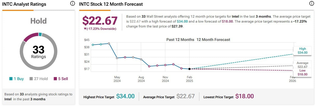 Nejvyšší cenový cíl pro akcie Intel je stanoven na hodnotu 34 USD za akcii a nejnižší na hodnotu 18 USD za akcii. Průměrný cenový cíl na nadcházejících 12 měsíců byl stanoven na hodnotu 22,67 USD za akcii.