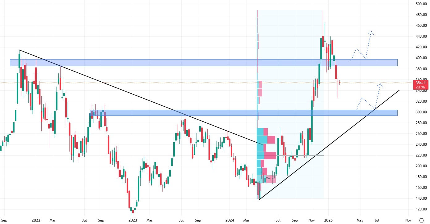 Akcie Tesla se obchodují v klesajícím trendu poté, co trh vytvořil své cenové maximum. To bylo velmi agresivně zamítnuto a trh při prodejní reakci prorazil i hodnotu předchozích cenových maxim.