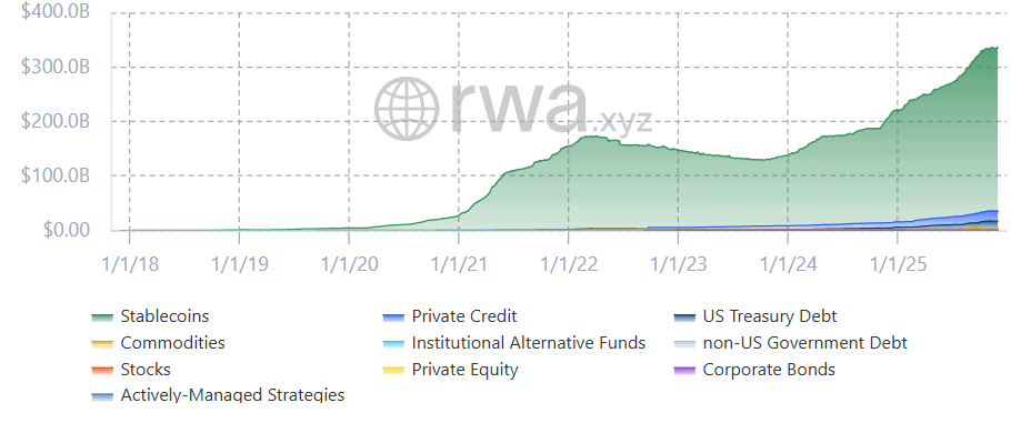 Podle dat RWA.xyz již byla tokenizována aktiva za 36 miliard dolarů a pokud k tomu přičteme stablecoiny, jedná se o částku ve výši 336 miliard dolarů.
