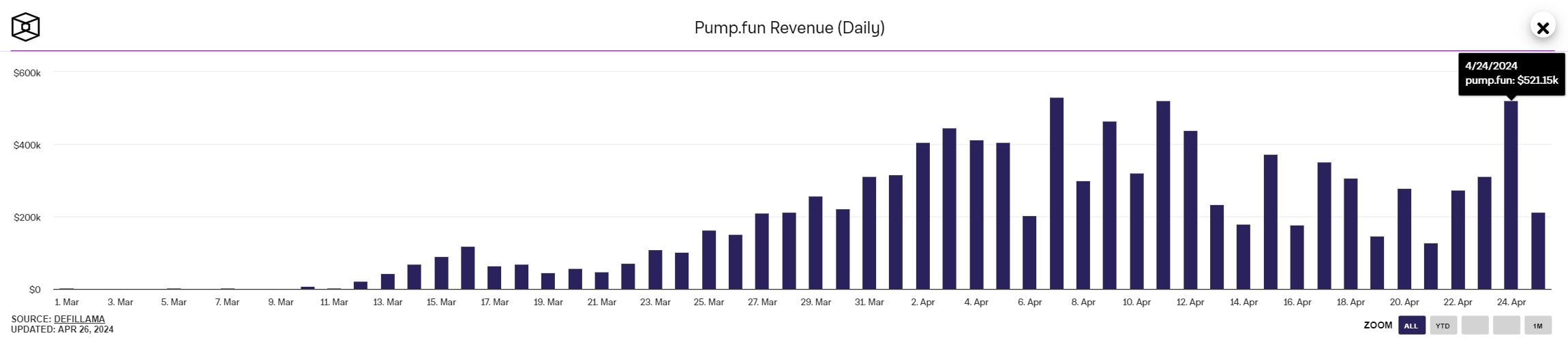 A tržby platformy se počítají v řádech milionů dolarů. Podle údajů DefiLlama inkasuje pump.fun příjmy i přes 500 tisíc USD denně.
