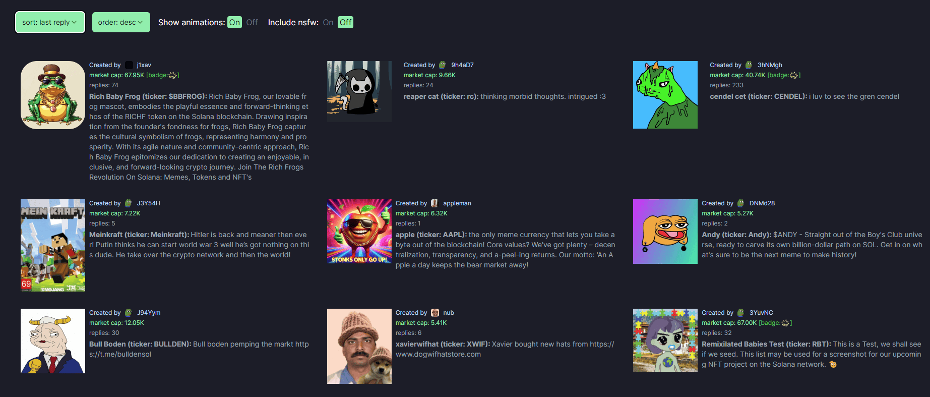 Hlavní stránka pump.fun s několika dostupnými memecoiny