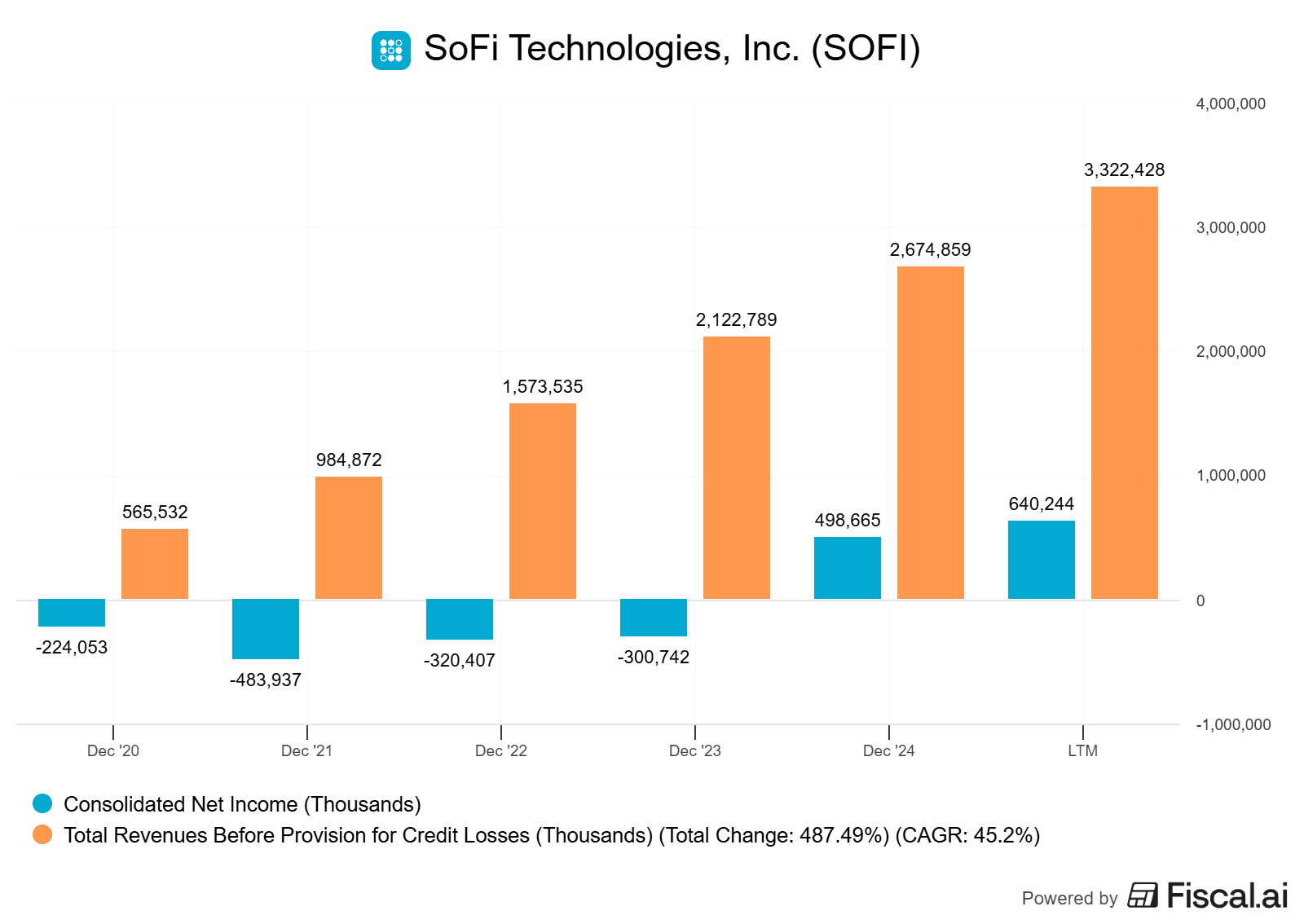 Finanční výsledky SoFi za 3. čtvrtletí 2025 byly ohromující. Tržby rostly meziročně 38% tempem na 950 milionů dolarů, přičemž čistý zisk vzrostl na 139 milionů dolarů, což představuje impozantní 129% nárůst.