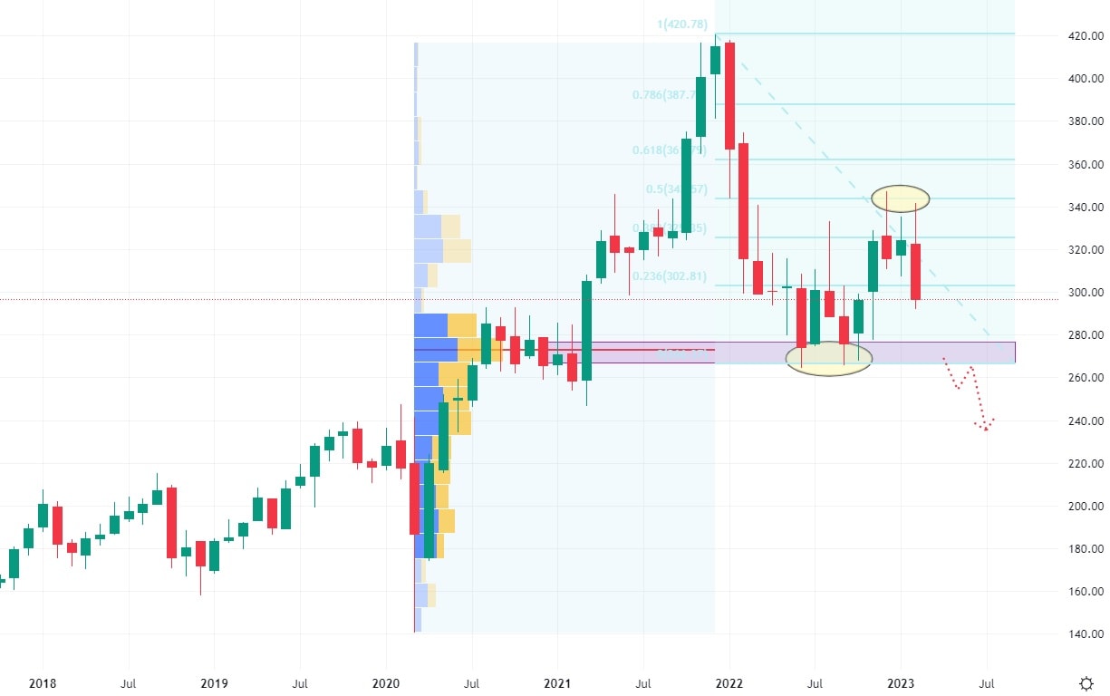 Akcie Home Depot si prošly silným cenovým propadem 35 %, který byl zakončen na supportní zóně se silným volume. Po krátké konsolidaci na cenové úrovni 280 USD trh vyrazil směrem vzhůru, otestovat hodnotu 50 % Fibonacciho retracementu. Nyní probíhá pokles ceny, přičemž již otestovaný support při dalším testu nemusí již plnit svojí funkci a může dojít k poklesu akcií pod 250 USD.