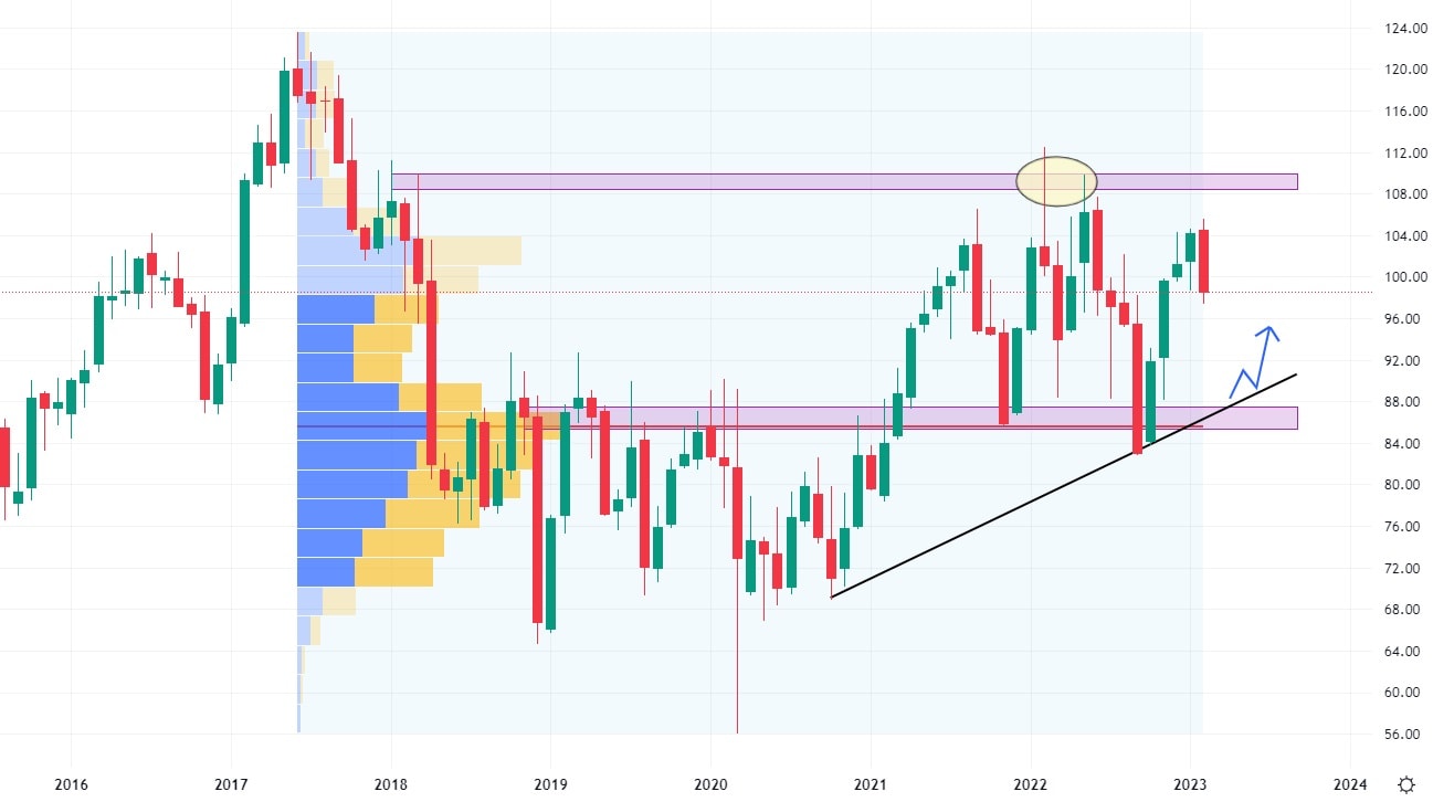 Akcie Philip Morris vykazují dlouhodobý rostoucí trend, přičemž cena se právě nachází na horní hraně rostoucího kanálu. Ještě z větší časové perspektivy se akcie této společnosti obchodují v cenovém rozpětí 125 – 65 USD. Tato kurzová stabilita je dividendovými investory velmi vyhledávána, protože brání výrazným kapitálových propadům na obchodním účtu.