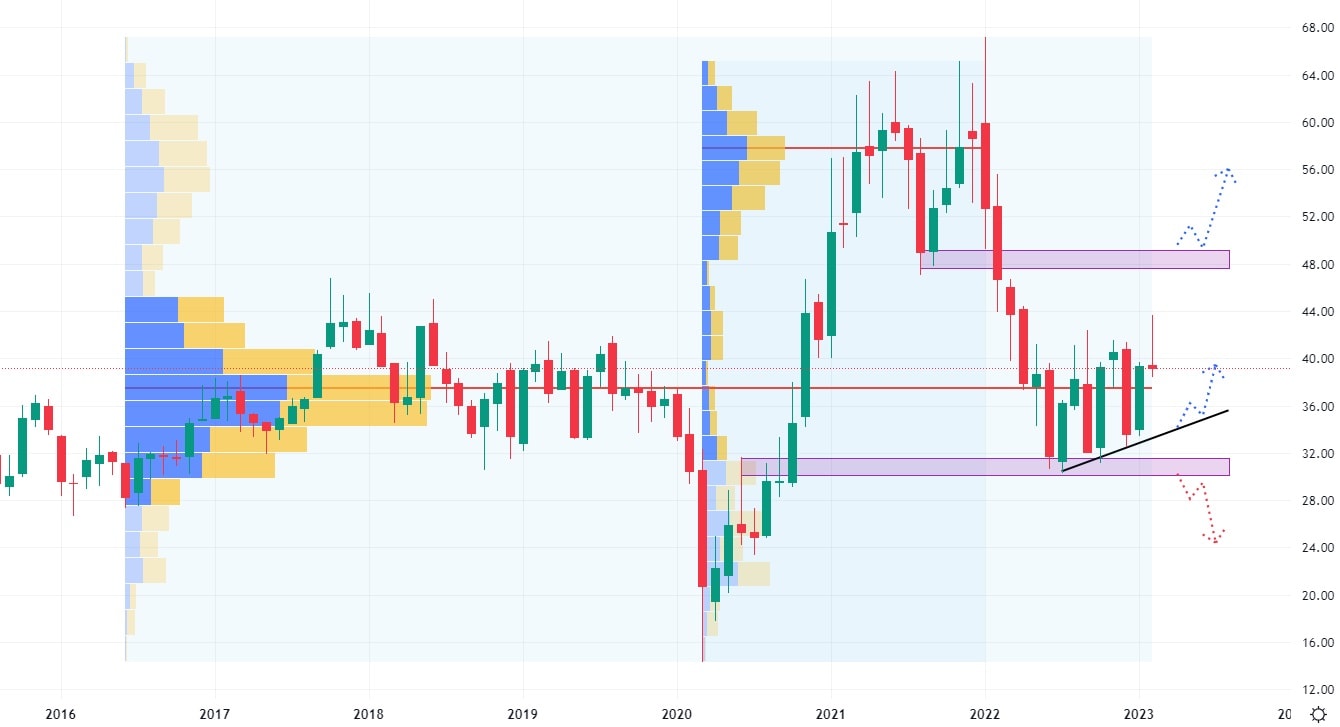 Akcie General Motors se obchodují v rostoucím trendu poté, co byl ukončen jejich cenový propad. Aktuálně se tvořící rostoucí trendový kanál, který se nachází v cenovém rozpětí tzv. férové ceny, která je reprezentována POC, vykreslovaným již od roku 2016. Nejbližší rezistence se nachází na ceně 50 USD za akcii a pokud trh nebude disponovat silným fundamentem, například výrazně klesající inflací, bude tato rezistence trhu bránit růstu.