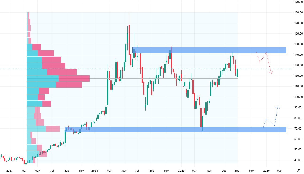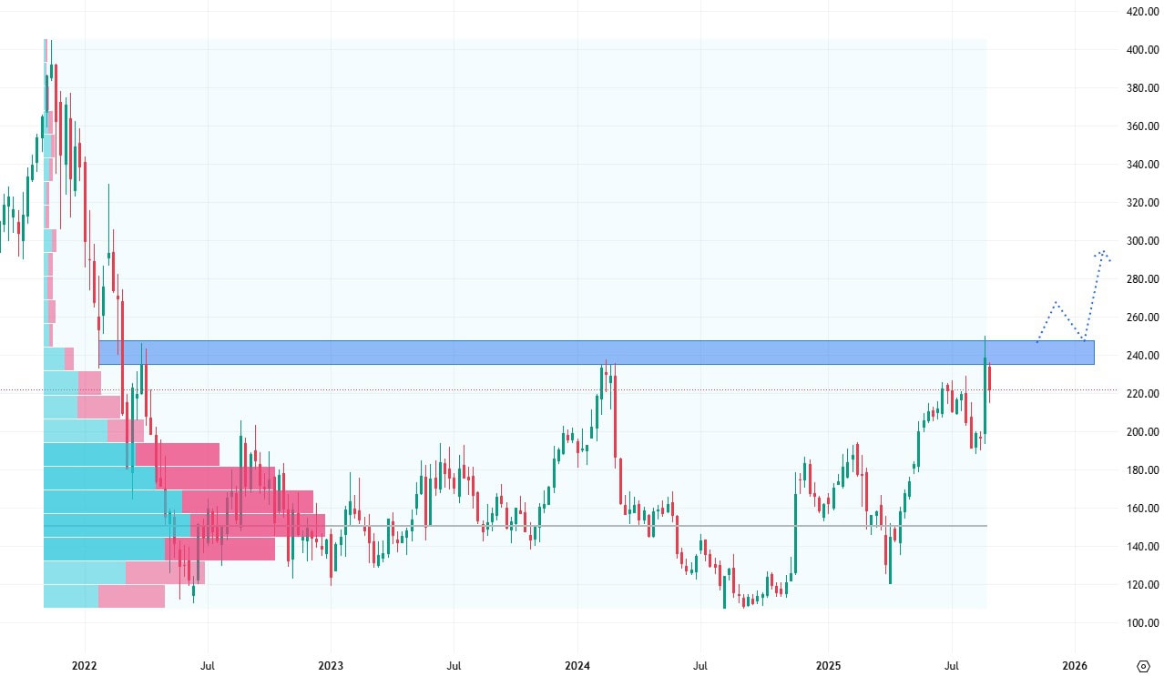 Akcie Snowflake se od roku 2022 obchodují v postranním trendu, během kterého jsou poměrně volatilní. Aktuálně akcie testují hodnotu rezistence a zároveň horní hranu postranního trendu. Průraz by poté znamenal možnost výraznějšího cenového růstu.