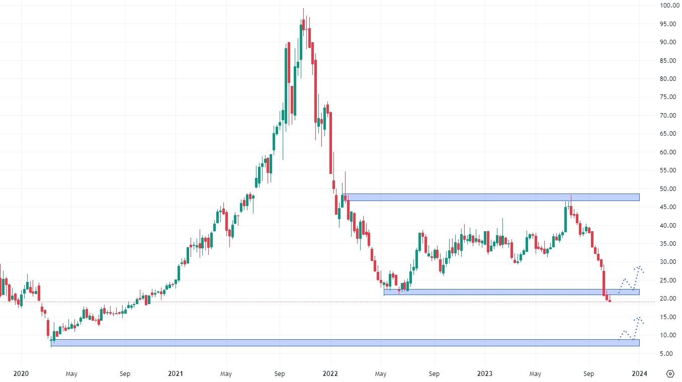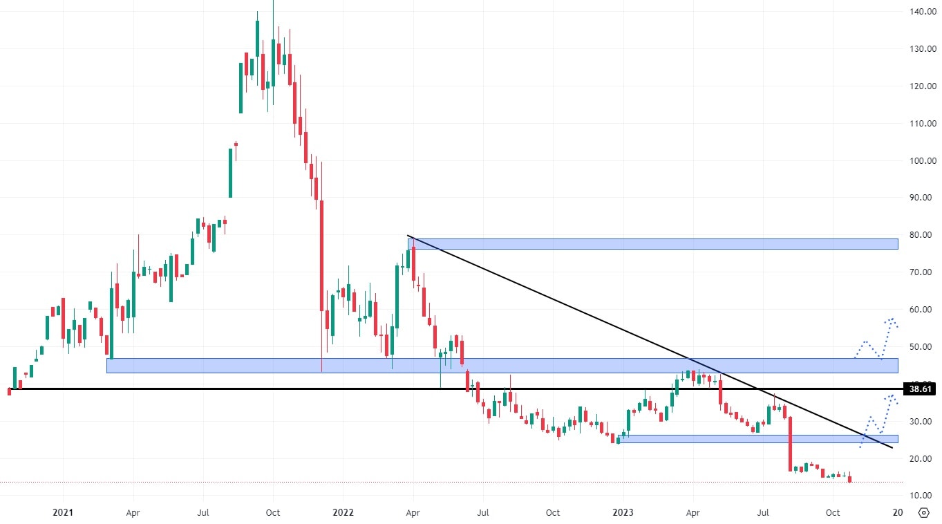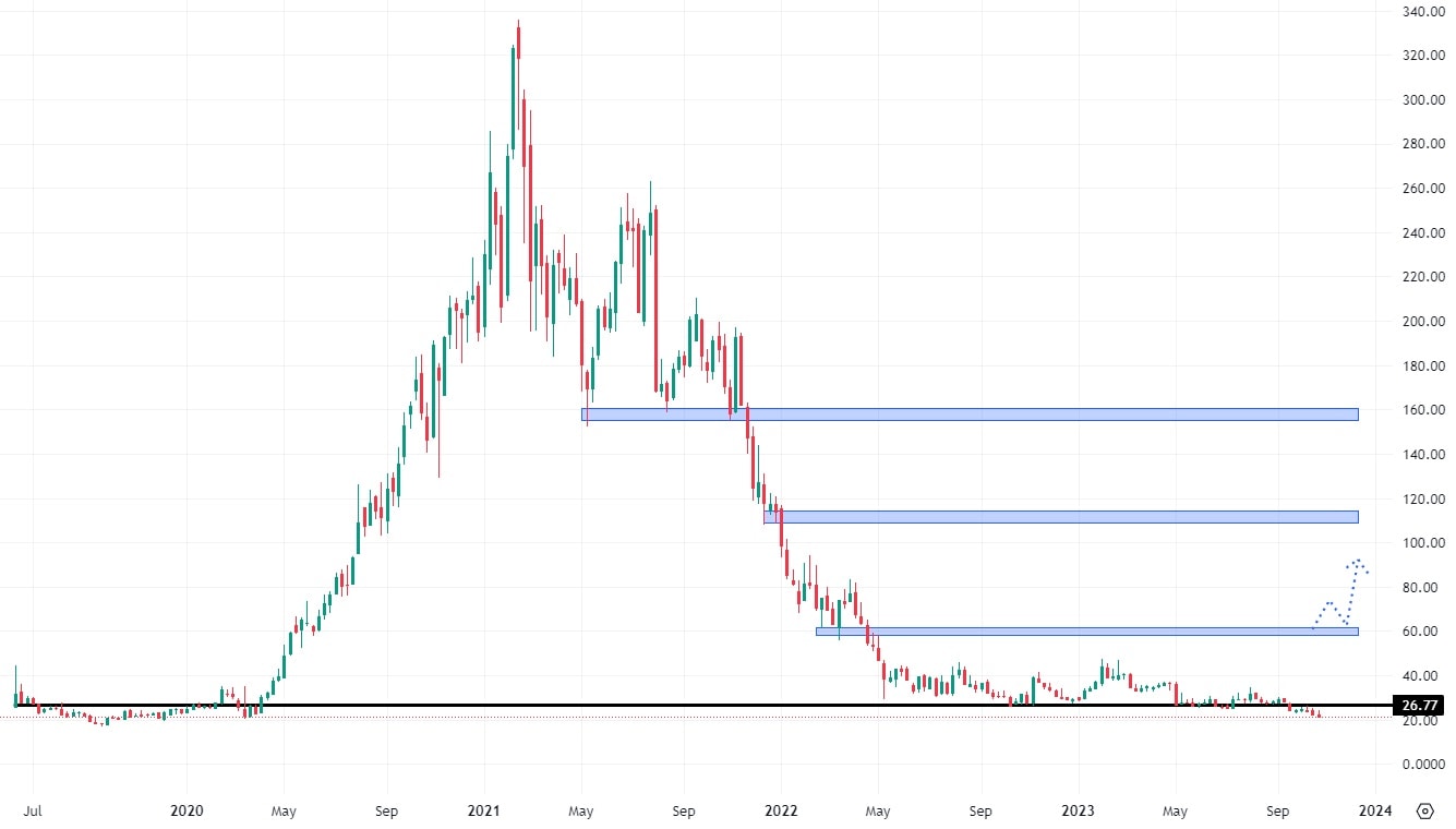 Akcie Nuvei se obchodují pod hodnotou klesající trendové čáry a také na svých dlouhodobých minimech. Aby se v jejich případě dalo hovořit o růstu, je potřeba překonat cenu 25 USD, kde se nachází konfluence trendové čáry a nejbližší rezistence. V opačném případě trh nevykazuje již žádné supportní úrovně, takže k růstu bude potřeba silného fundamentu.