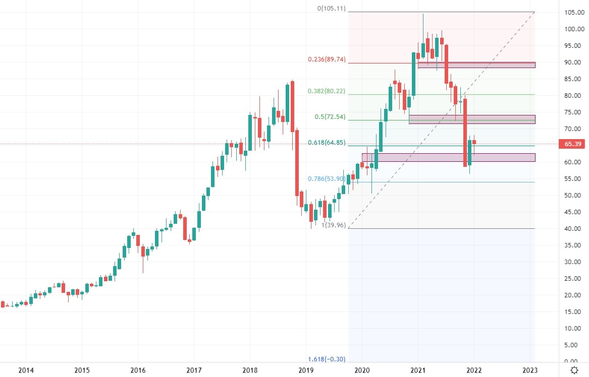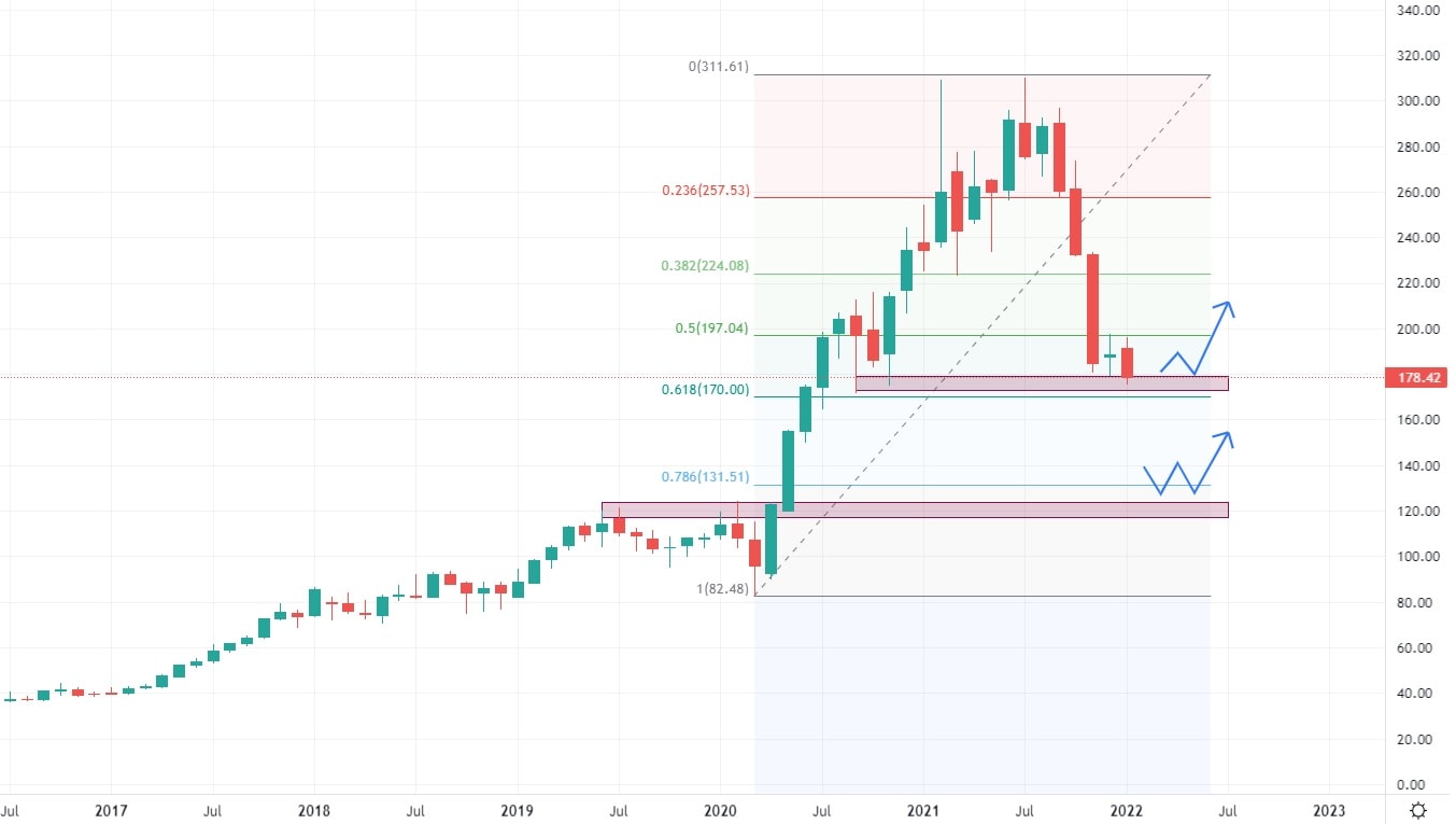 V současné době se akcie PayPal obchodují na supportní zóně tvořené dlouhodobými Low v konfluenci s 61,8 % Fibonacciho retracementu. Na tuto zónu trh v minulém měsíci reagoval slabou nákupní aktivitou, která vyústila v technickou formací Doji svíčky, která značí nerozhodnost trhu.